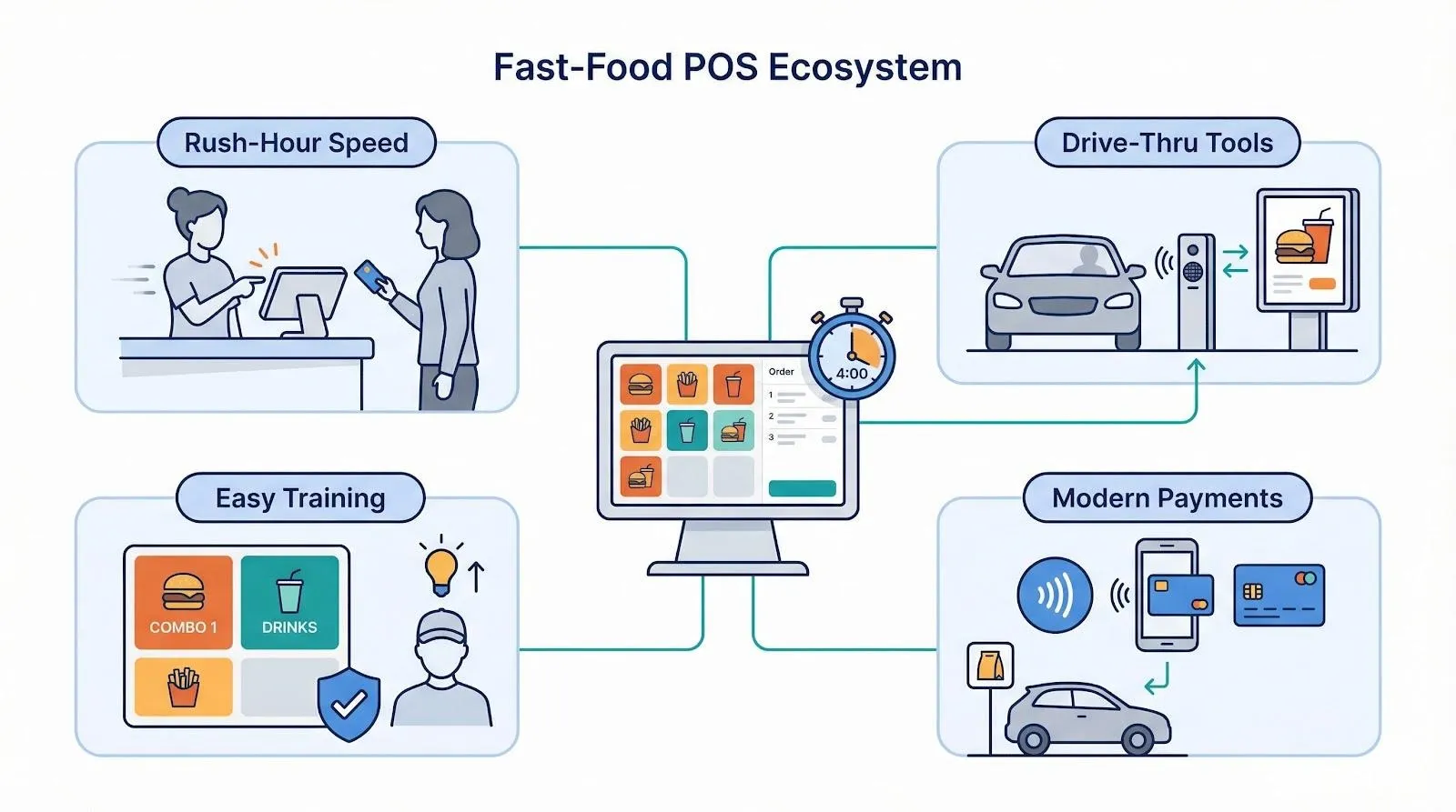 Turnover adds pressure. When half of your cashiers are brand-new every ninety days, you need an interface they can master in minutes, not hours. A purpose-built quick-service POS uses color-coded buttons and guardrails that prevent order errors, so new staff hit the ground running.