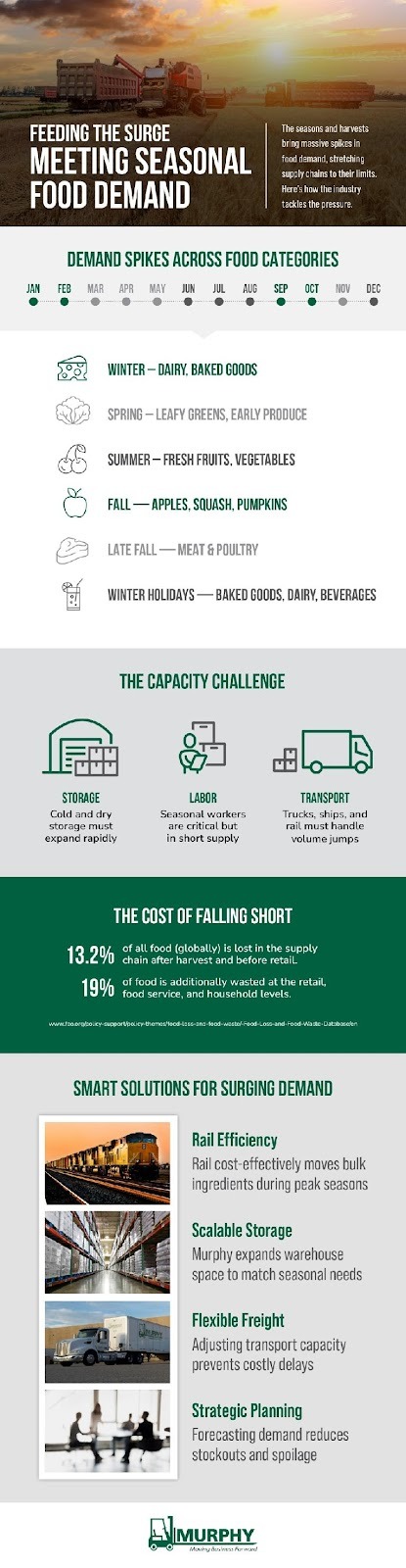 Meeting seasonal food demand requires more than reacting to spikes. It depends on preparation, coordination, and flexibility across the supply chain. Businesses that align forecasting, sourcing, storage, and distribution build resilience into their operations. With the right systems and partnerships in place, seasonal shifts become opportunities to grow rather than challenges to survive. Look over the infographic below for more information.